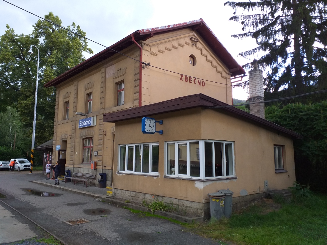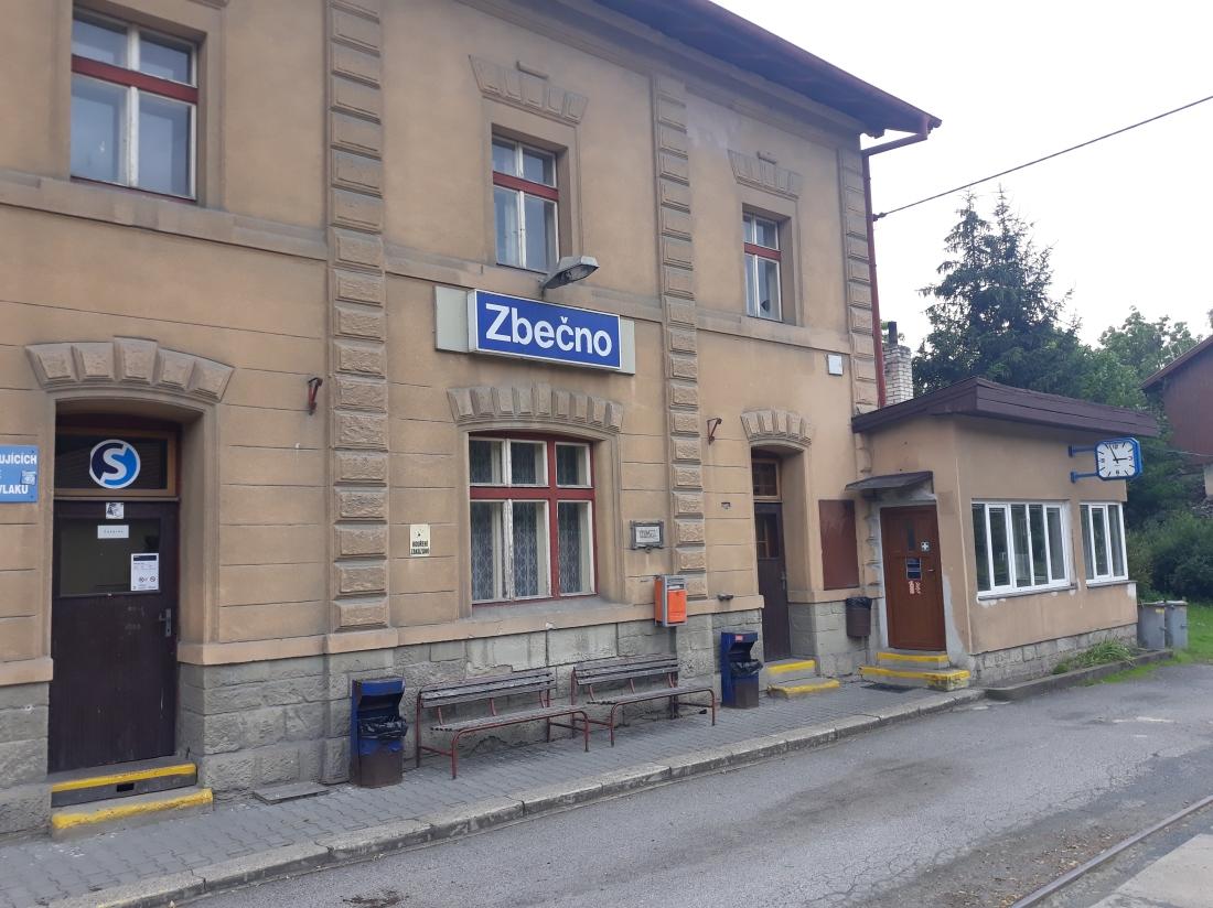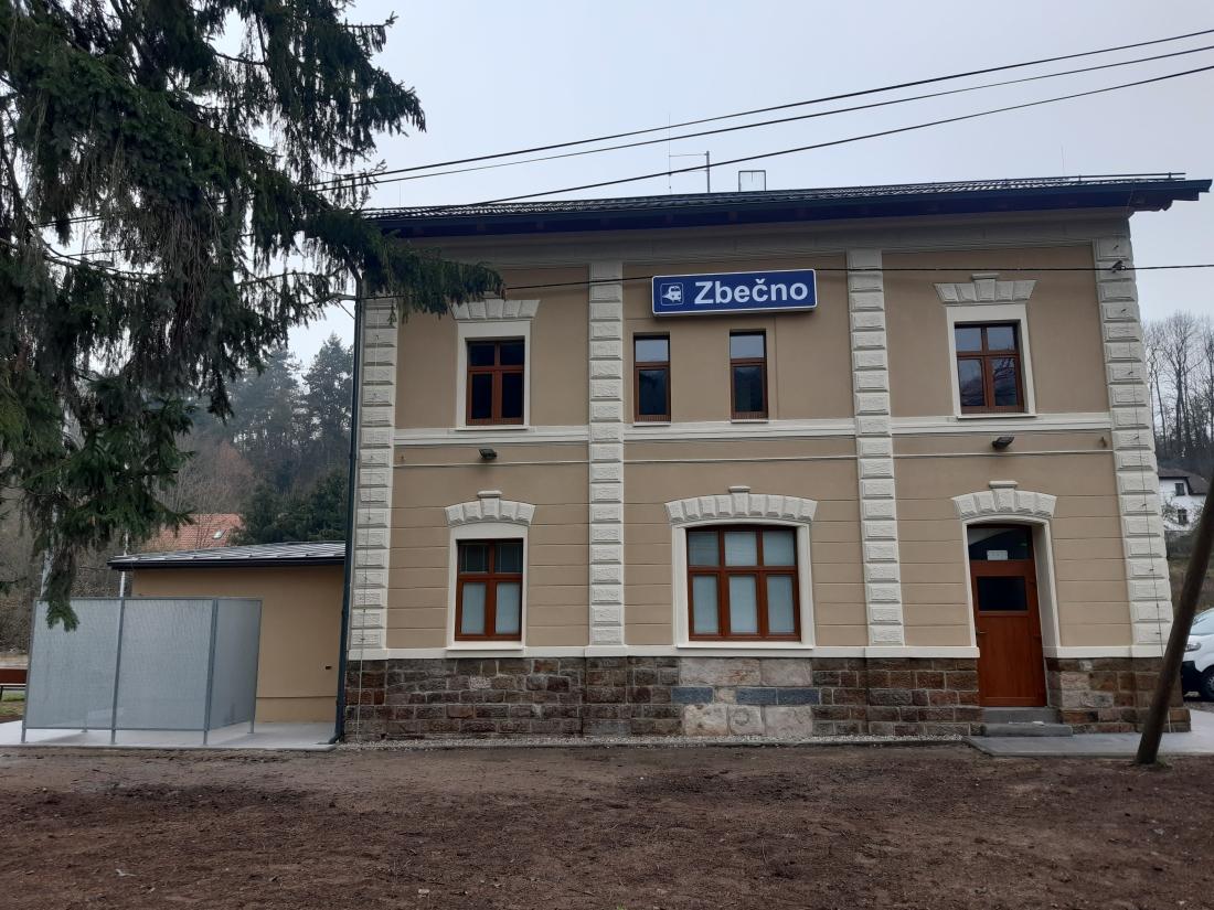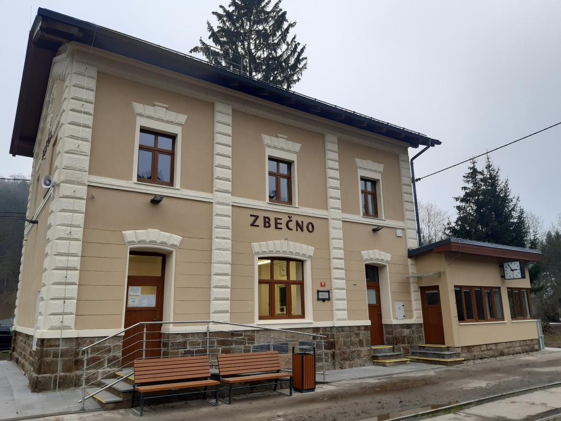 Oprava výpravní budovy v žst. Zbečno zahrnovala nové barevné řešení fasády a střechy, opravy zpevněných ploch a vnitřních prostor, výměnu otvorových výplní a demolici nevyužívaných objektů včetně přístavby vodárny.